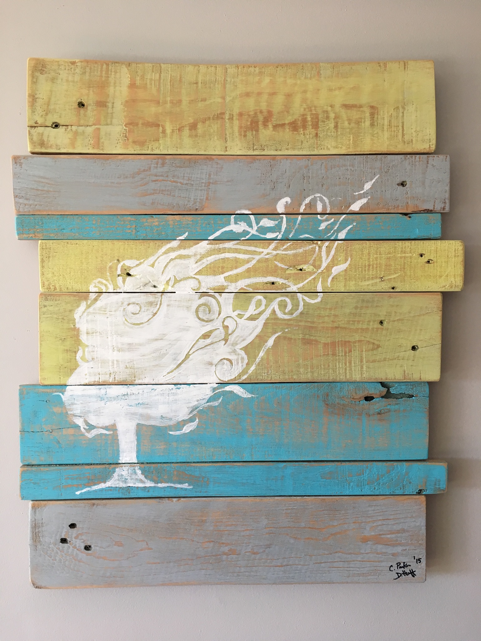 Clearly this artisan loves trees and the magnificent wood produced from them. This piece is hand-painted, made from pallet wood, and highlights the natural whisking beauty of a Spring tree.